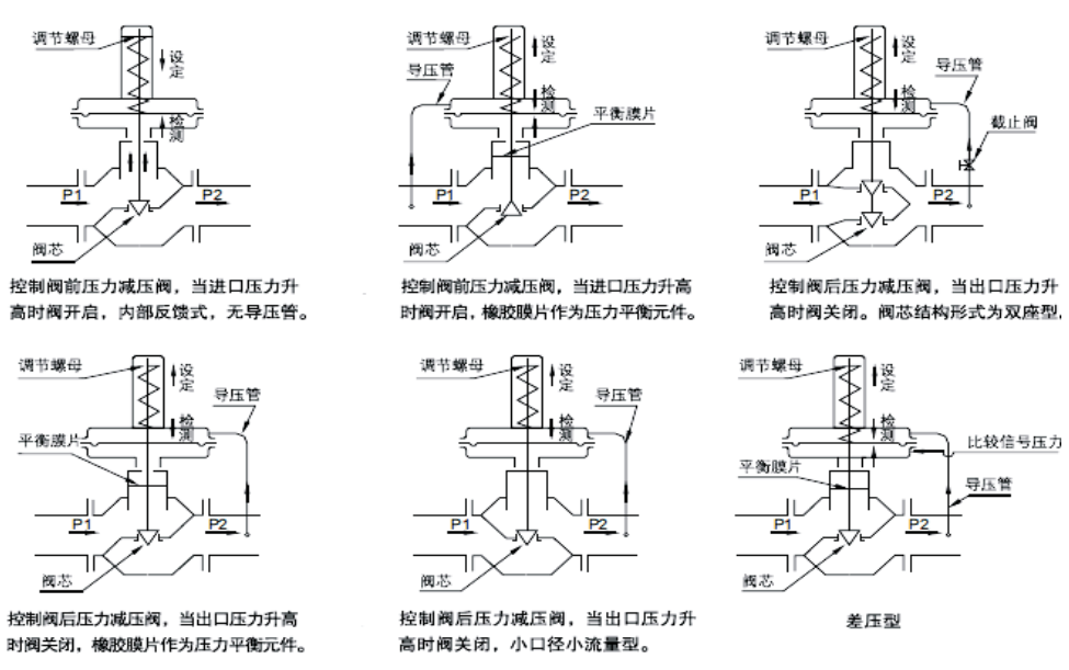 该阀在其阀后取压,阀芯初始在开启位置,当阀后压力升高时,阀芯开度逐渐减小,改变阀后压力和流量,使阀后压力稳定在给定值,达到减压稳压的目的。该阀门广泛应用于气体、液体及蒸汽介质减压稳压的自动控制。